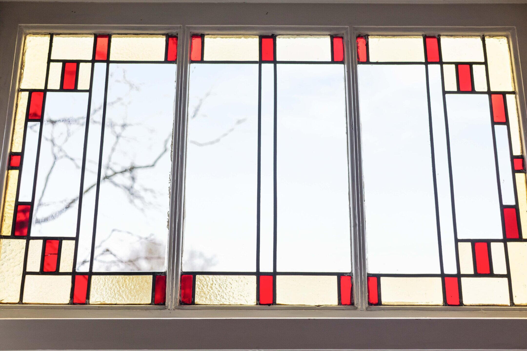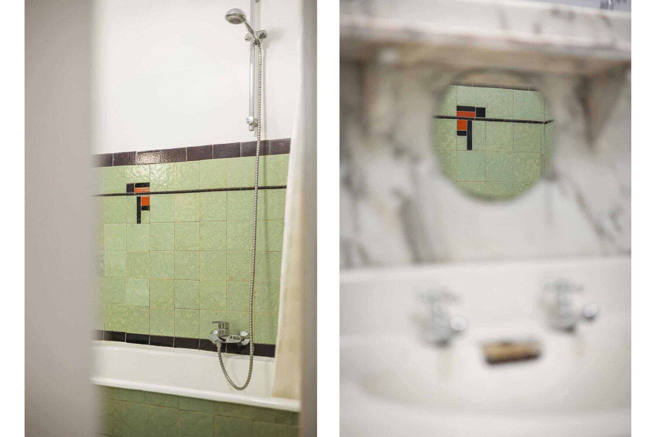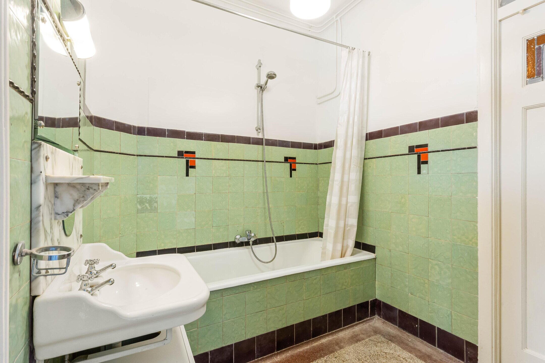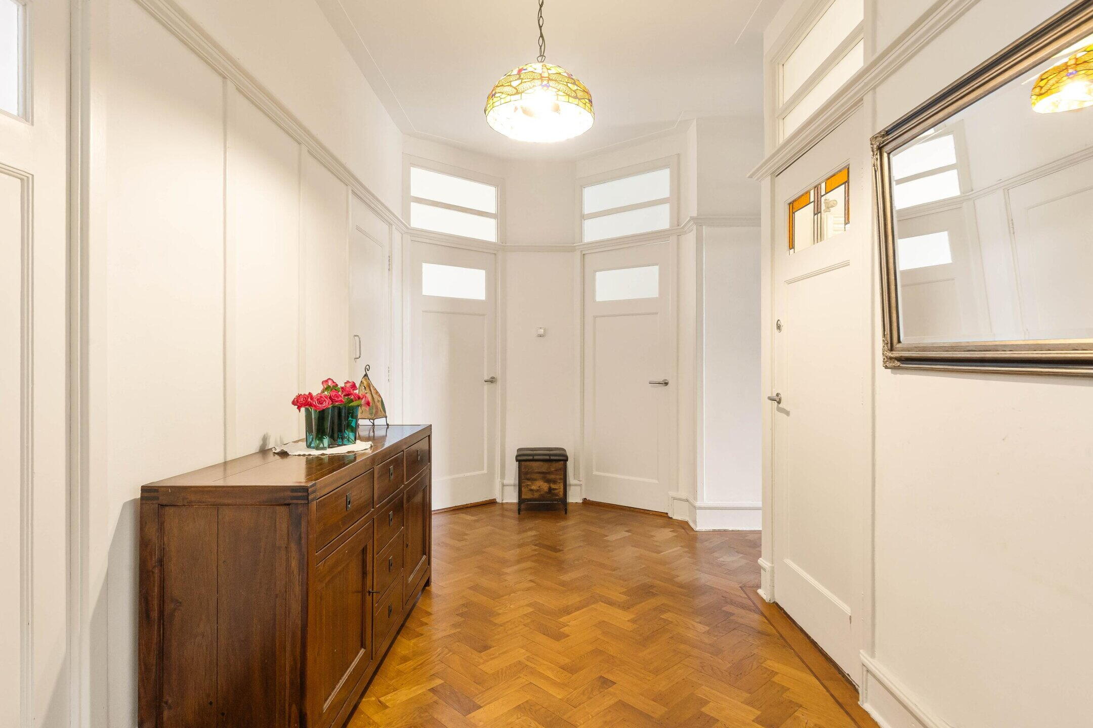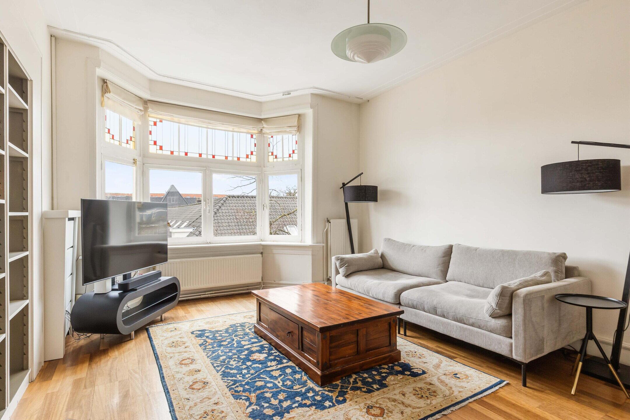 At the front of the property, you’ll find the generous and bright living room featuring a characteristic bay window and large stained-glass windows, allowing an abundance of natural daylight to flood in. There is also an unobstructed view over the quiet square. The living room connects to the dining room through en-suite sliding doors, from where French doors open onto the rear balcony. The apartment boasts no fewer than three balconies, all west-facing.