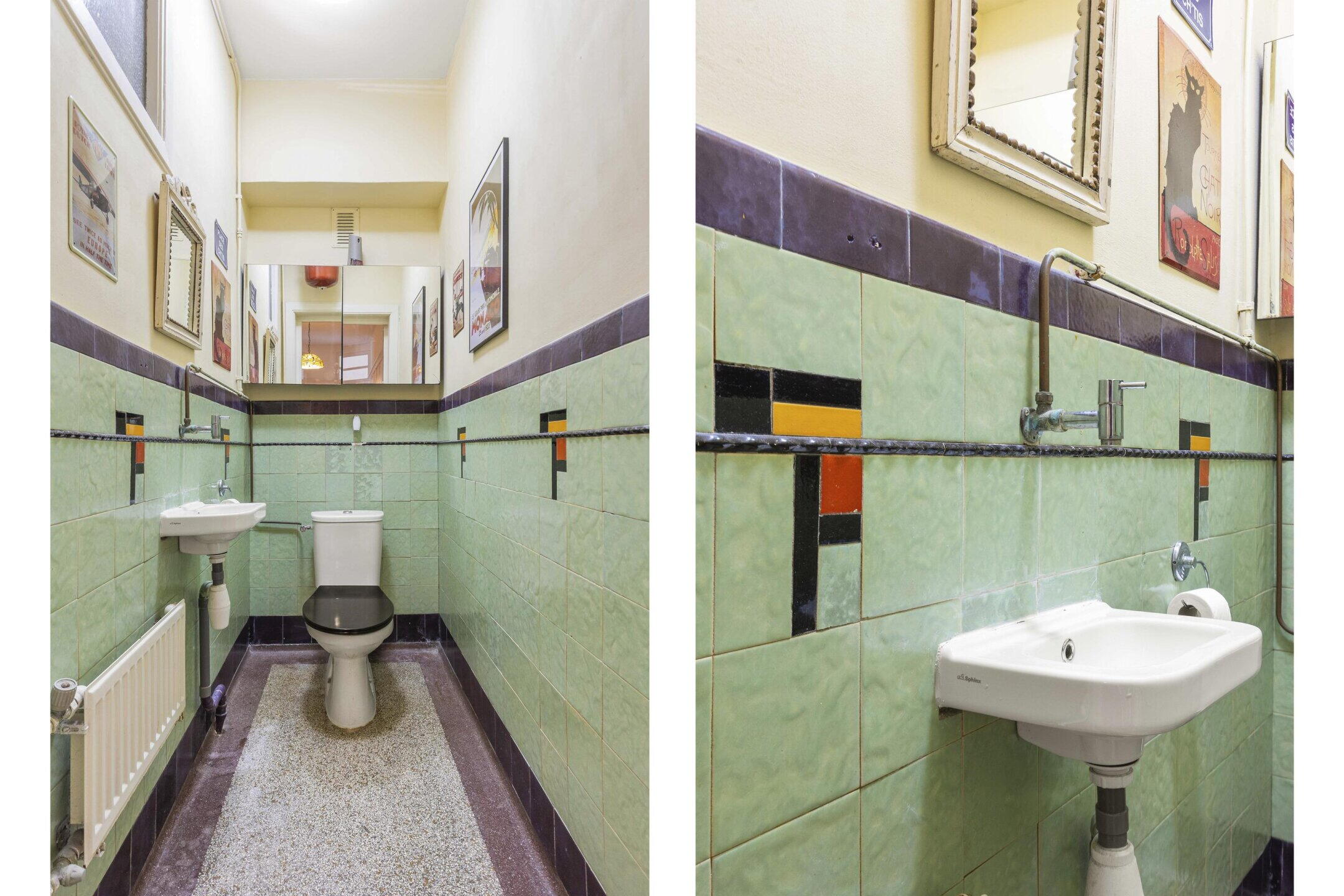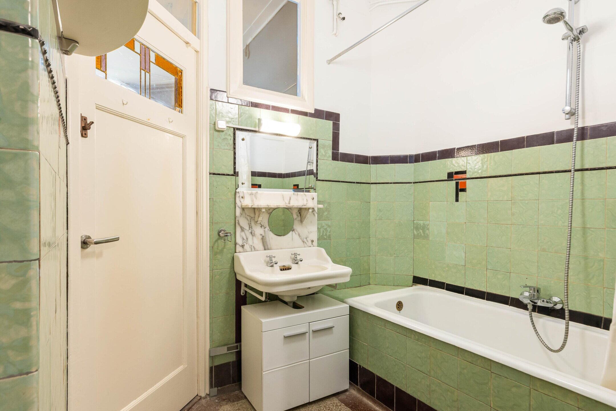 De badkamer is voorzien van een comfortabel ligbad en wastafel, uitgevoerd in karakteristieke stijl. Daarnaast is er een separaat toilet bereikbaar vanuit de hal bij binnenkomst.