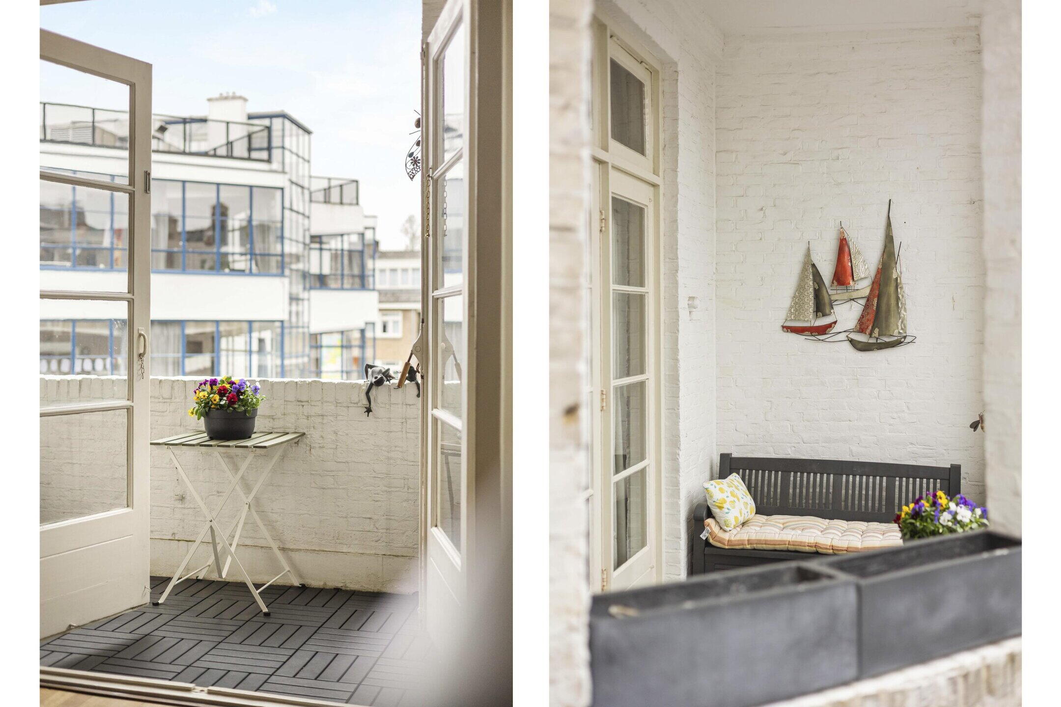 Aan de voorzijde bevindt zich de royale en lichte living met karakteristieke erker en grote glas-in-lood raampartijen, waardoor het daglicht rijkelijk binnenvalt. Tevens is er vrij uitzicht over het rustige plein. De woonkamer staat door middel van en-suite schuifdeuren in verbinding met de eetkamer, vanwaar de openslaande deuren toegang geven tot het balkon aan de achterzijde. De woning telt maar liefst drie balkons, allen gelegen op het westen.